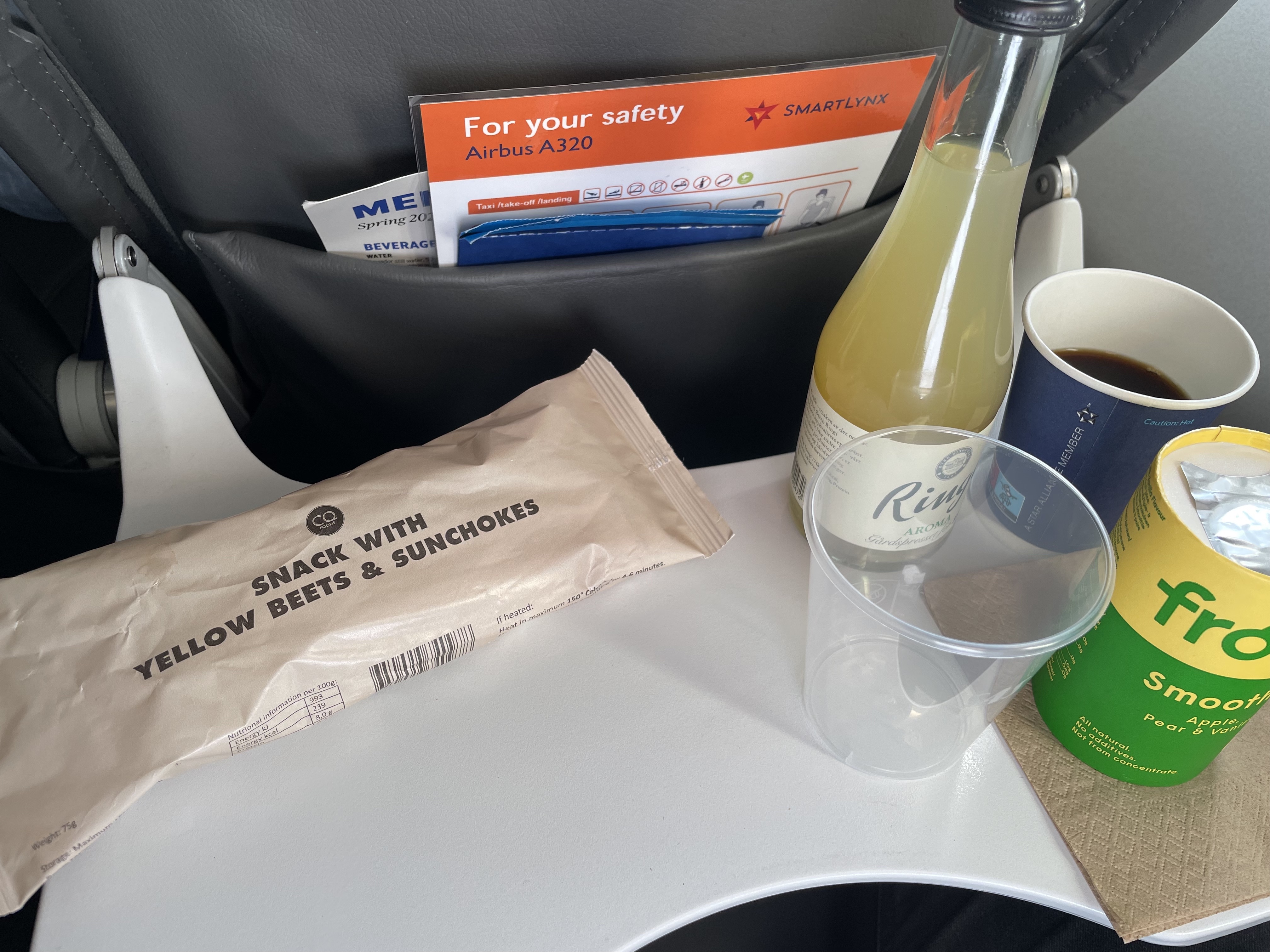 Min första runda med SmartLynx idag, SK130 MMX-ARN, avgångstid 06:10. Ingen frukost lastad (eller funnen?) så istället serverades "Snack with yellow beets and sunchokes" så länge lagret räckte och därefter knäckebröd... övrig catering var dock lastad, så jag överlevde. Men jag har likväl skickat in ett kundtjänstärende och påpekat min besvikelse.