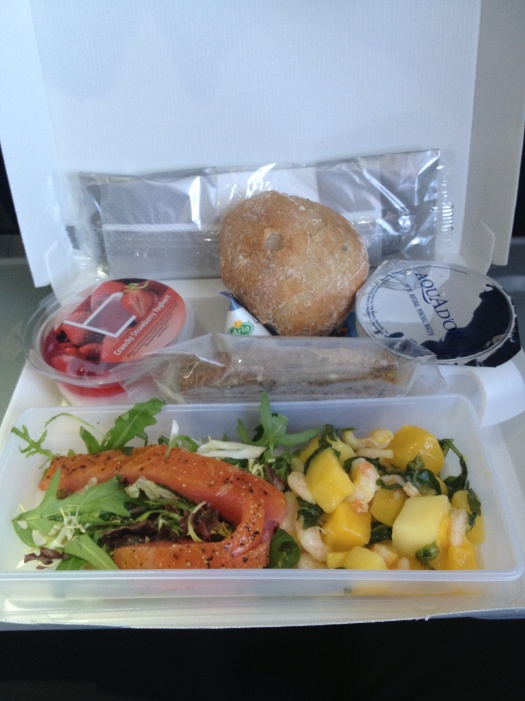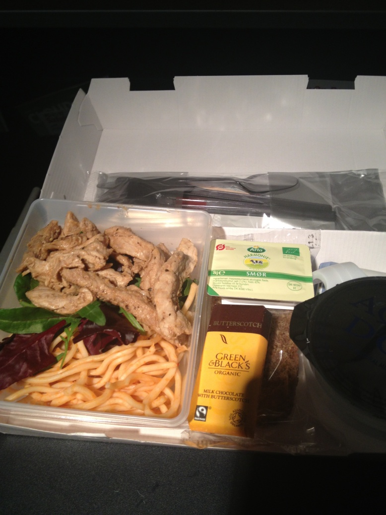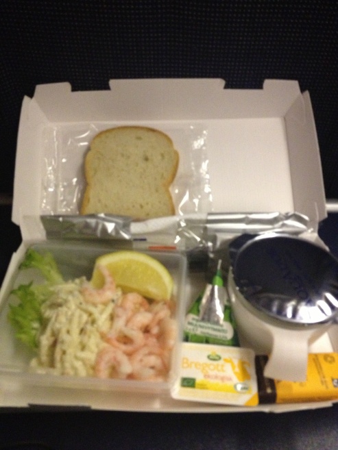 På grund av bristfälligt utrymme förblev maten ouppackad. Det gick helt enkelt inte att äta sittandes i ett mittsäte inklämd mellan två bastanta danskar. Den här anrättningen har jag dock ätit skapligt många gånger så vet vad jag gick (eller inte gick) miste om.