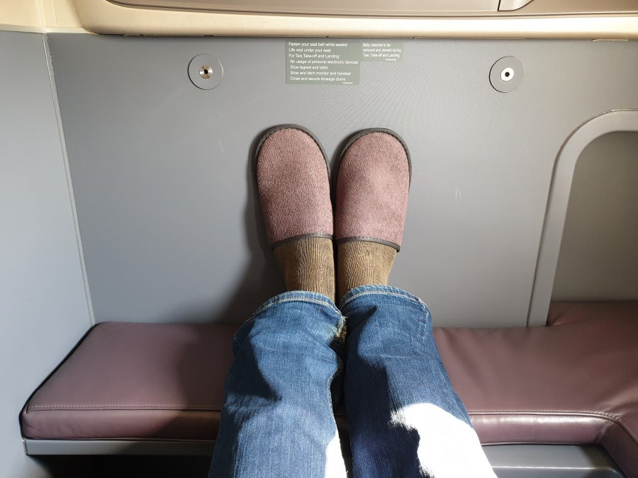 Några minuter senare är hon förbi igen och noterar att jag enbart ätit de kanderade cashewnötterna och undrar om jag vill ha en skål med enbart sådana istället. Blir även erbjuden pyjamas och amenity kit som jag tackar ja till (kan dock undra varför jag aldrig fick några tofflor). Hinner med 3 glas bubbel innan vi ska starta, helt klart en fördel när man boardar så tidigt.