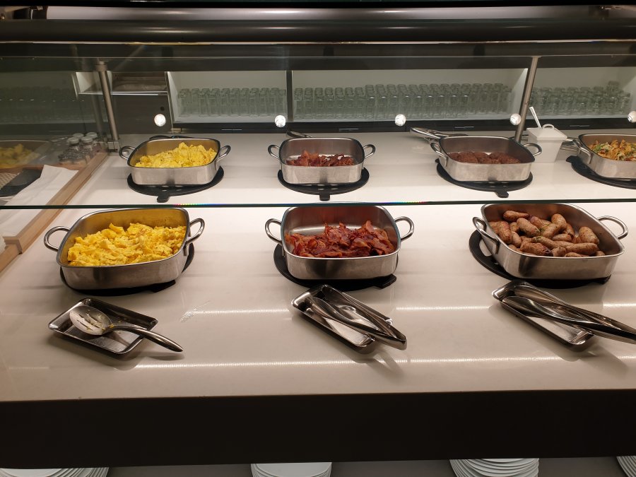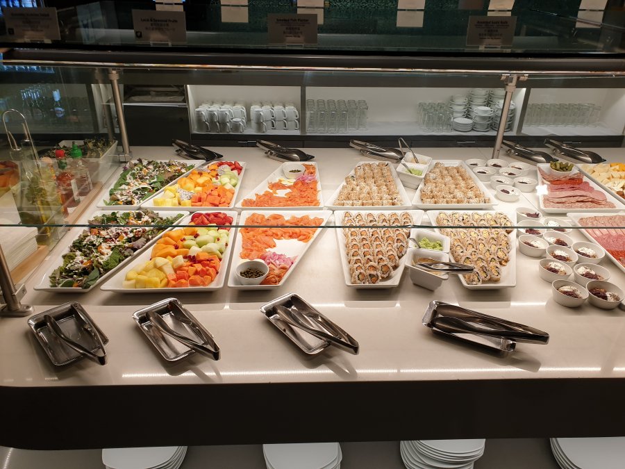 American Airlines (och även JAL loungen) är ordentligt gömd, inga skyltar alls men de sa vid checkin att den var ovanpå foodcourten. Tog en stund innan jag hittade dörren med trappan upp. Loungen i sig är stor och näst intill folktom. Självservering av mat och all dryck (även alkohol).