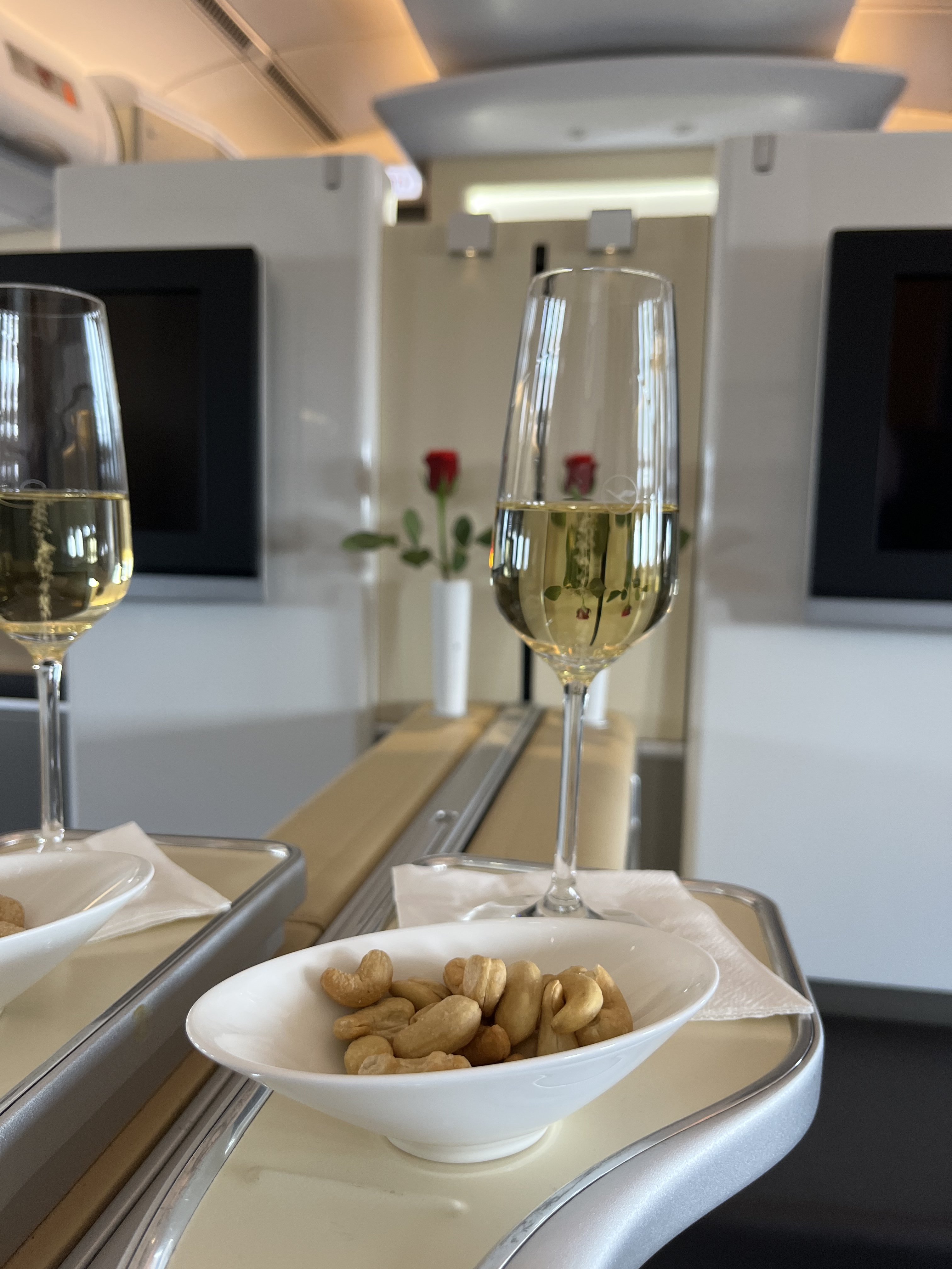Vi har här i Polaris haft nöjet att njuta en trerätters i restaurangen och nu är det några cocktails som gäller i väntan på boarding. Riktigt mycket folk när vi kom hit, men fanns ändå sittplats och tog runt 40 minuter att få bord i restaurangen. Maten var bra, bättre än någon SAS-lounge men inte i nivå med LH First i München som vi hade på utvägen. Min vapendragare GP är dock extatisk över utsikten, fullfjädrad flygplansnörd som han är. Här kan han njuta av plan som landar och taxar! Har blivit mest Boeing - varvat med Negroni, GT, Champagne och en Miller Lite (förlåt Palmen, men det var GP, inte jag).