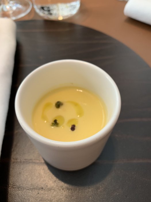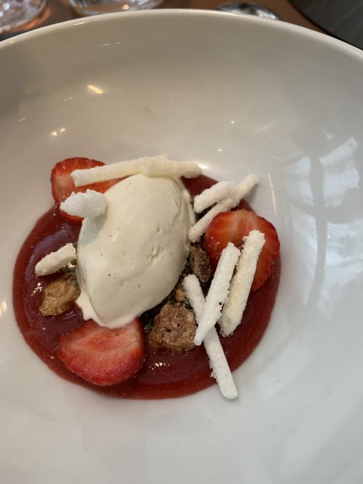 Maten denna lördagskväll var minst lika vass, oerhört vacker och lagom innovativ. Det enda störningsmomentet är all denna kringförsäljning som ska ske - bättre vin, ost, vin till ost, champagne (annars är det vatten som gäller till de åtta snacks som först serveras...), kaffe och kaffegodis osv osv.