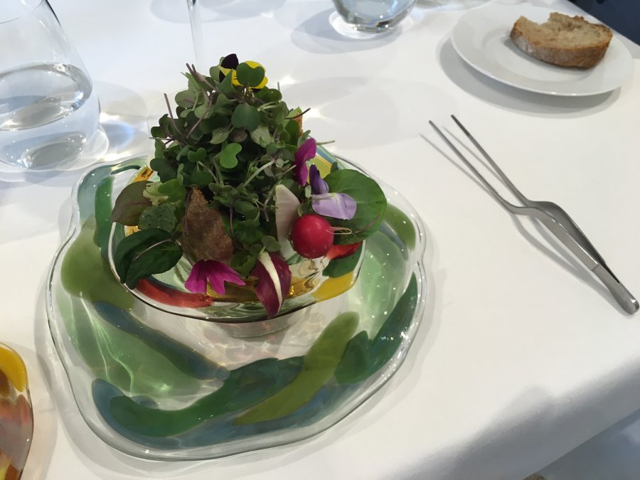 Första uppdukningen var kändes som två tusen tallrikar på bordet. Det var berg i porslin, det var en skål med blå buljong som var fisk buljong men såg mest ut som toalettvatten (dock bra smak med en tepåse med fisksmak).