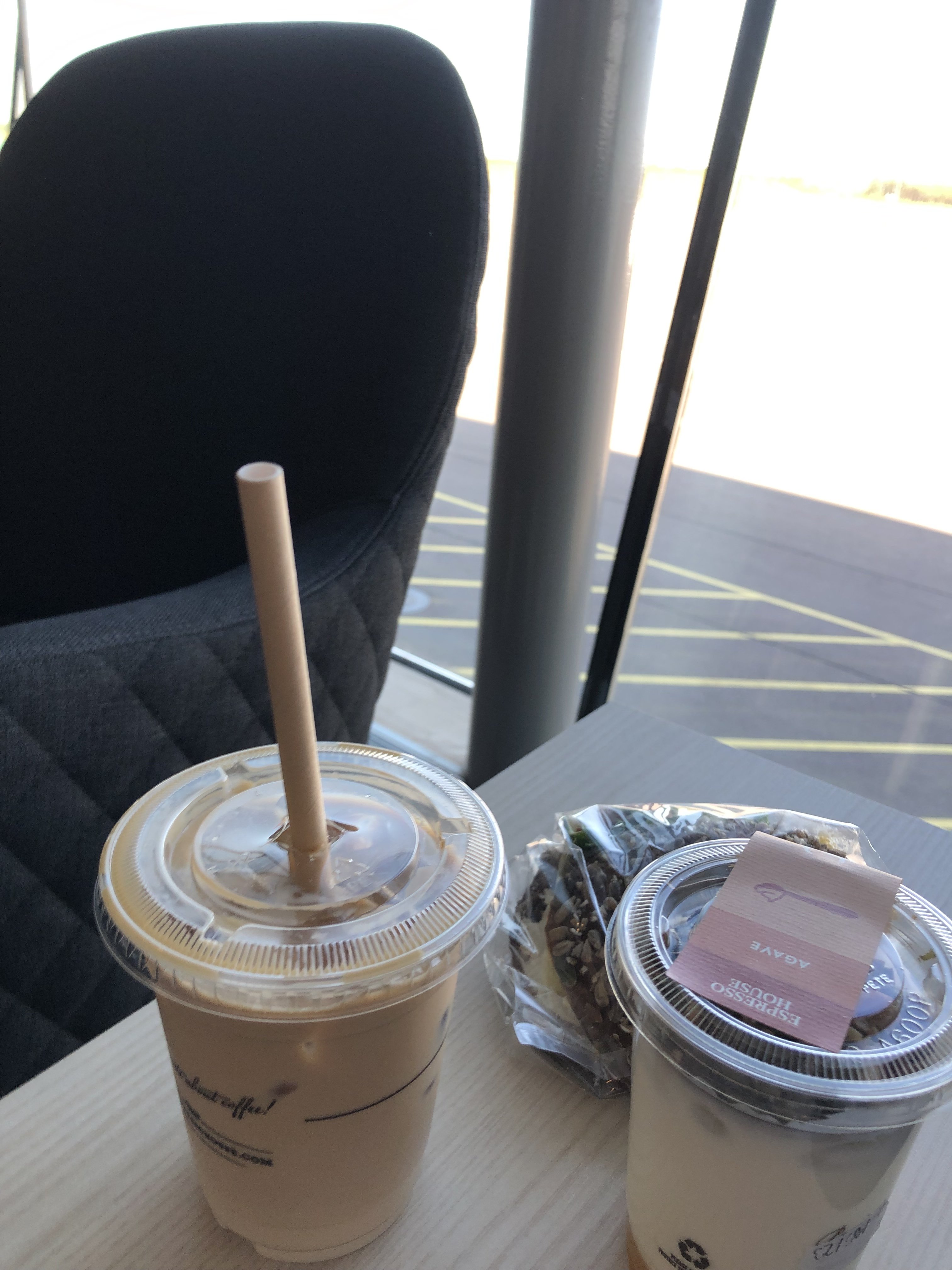 Kvinnan i duty-free meddelade att de inte begränsar mitt första inköp av fika till 1 flaska. Dagen börjar bra.