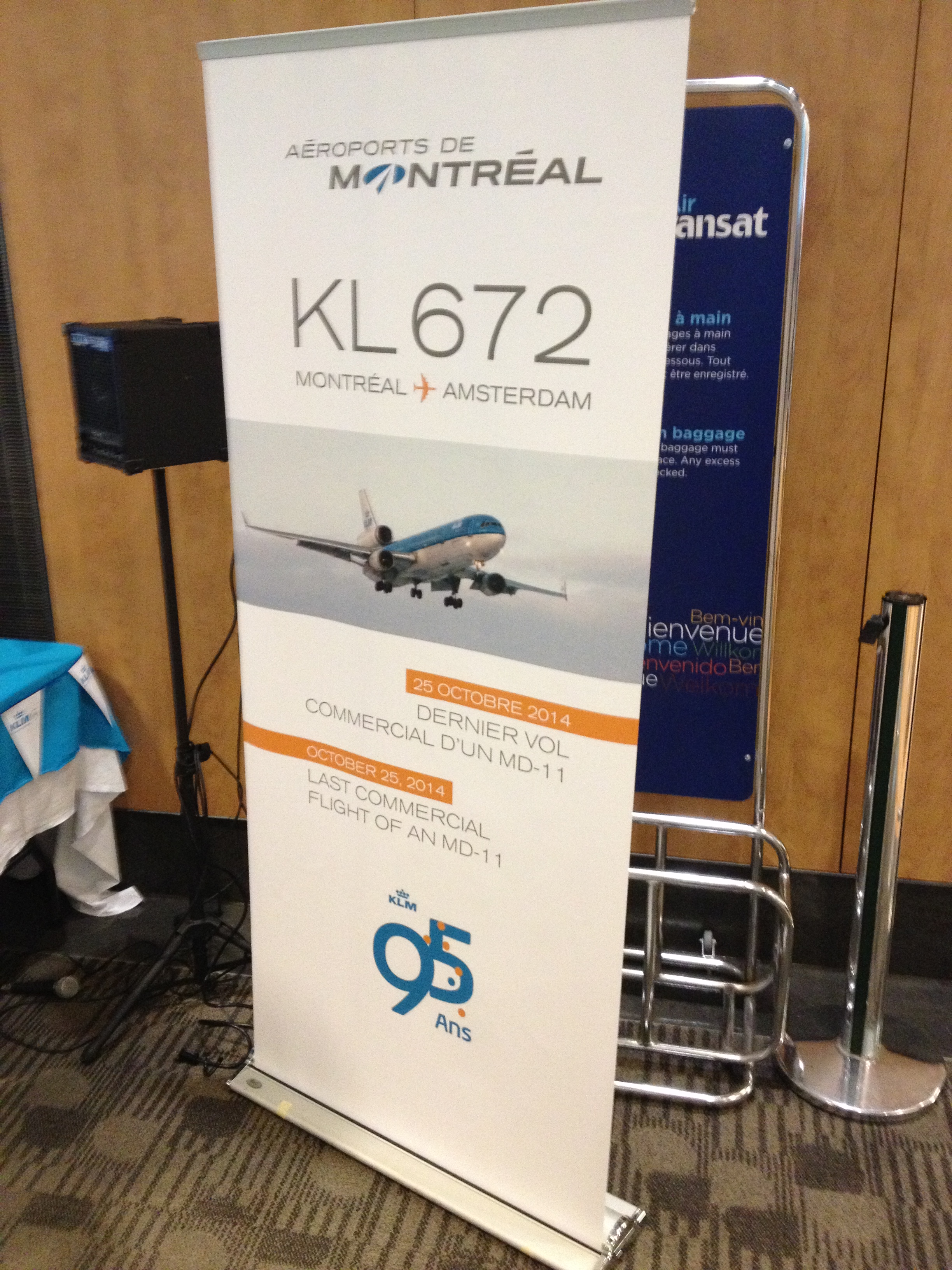 Som redan nämnts har KLM promotat flygningen ganska bra och dagens flygning var helt proppad med en fullbokad BC och folk på stand-by lista för Eco. Påväg till loungen mötte jag folk som kom med flyget från Amsterdam. Redan då var stämningen hög och gaten var full med KLM-personal, entusiaster och ett dukat bord med dricka och fina KLM-muffins. Det fanns också en skärm där besökare blev fotograferade för att sedan få en bild med sig själva och en MD-11 med Montreal bakgrund. Fin gest och mycket bra stämning, massa glada människor och personal från flygplatsen och KLM som berättade om planet, dess historia.