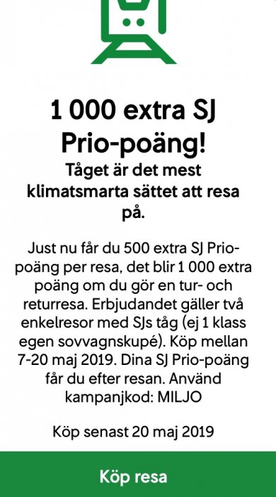 Samma här. Tyckte det var dig jag såg på tågetTestade att boka Örebro C-Örebro S med kampanjkod MILJO, men inga extra poäng ännu. Kampanjen kan kanske vara knuten till person.