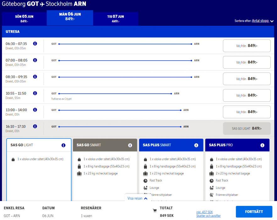 GOT-ARN-SDL 6 Juni kl 16.10-18.55 kostar 3021 kr/person (Go light)