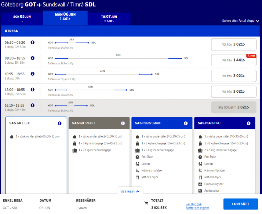 Biljetten GOT-ARN-SDL 6 Juni kl 8.30-18.55 är dock prissatt i bokningsklass (L,L) för summan 1441kr vilket är 307kr billigare än att köpa biljetterna separat.
