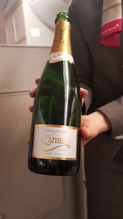 Extremt varma handdukar delas ut och vi blir tillfrågade vad vi vill ha att dricka - champagne. Frugan frågar vilken sort det är som serveras men har lite svårt att förstå det koreanska uttalet av 'Cattier Brut' så värdinnan kilar och hämtar flaskan och visar.