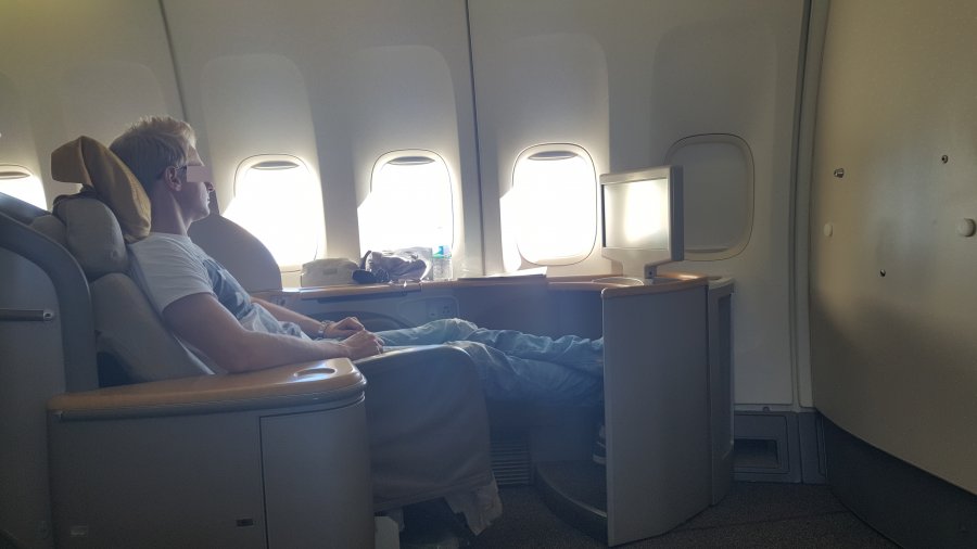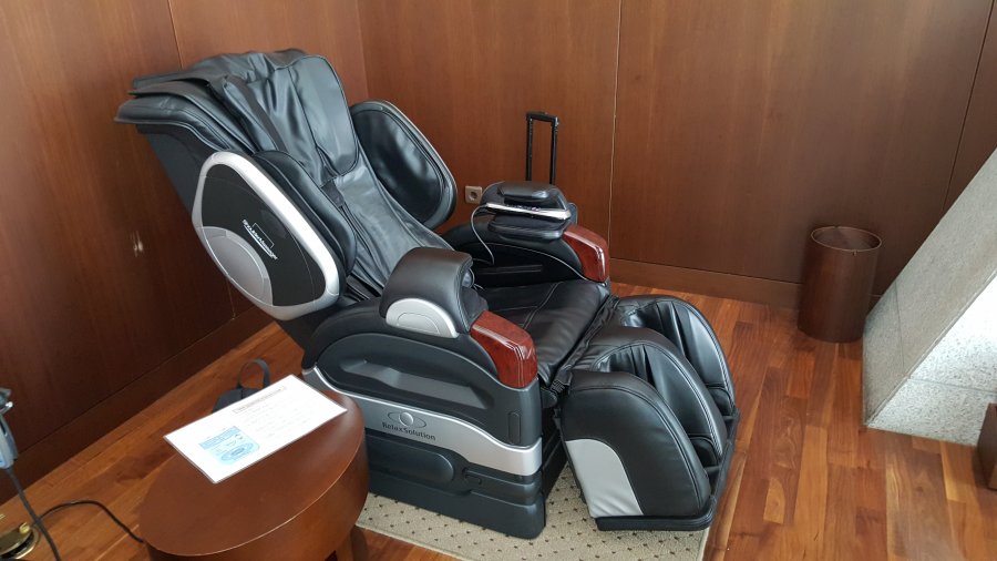 Krånglar mig ner i en av stolarna men inser rätt snart att den är gjord för den asiatiska marknaden. Mina 183 cm är långt ifrån optimala och det inte finns en sportkeps att jag kommer kunna sova i den. Frugan däremot slocknar rätt omgående.