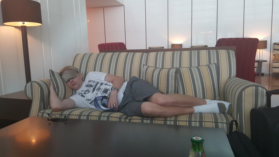 Vi går in i en väldigt folktom lounge och går direkt till en värdinna för att fråga om det finns någonstans att sova. Hon säger att det finns och visar oss till ett relax-rum.