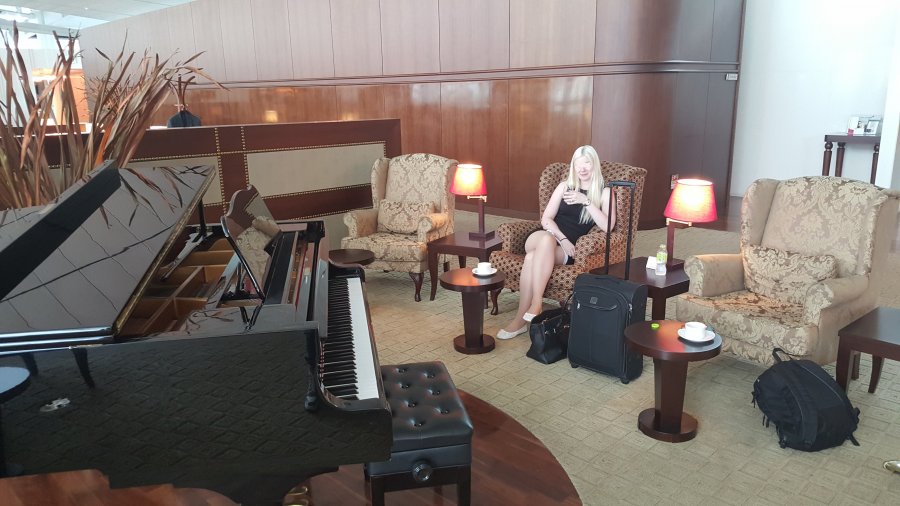 Fast trackar oss genom securityn och beger oss mot SilverKris-loungen med en lite kurrande kista då vi inte ätit middag än.