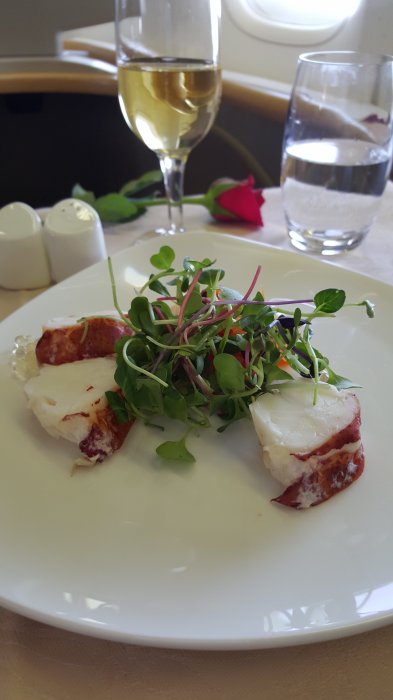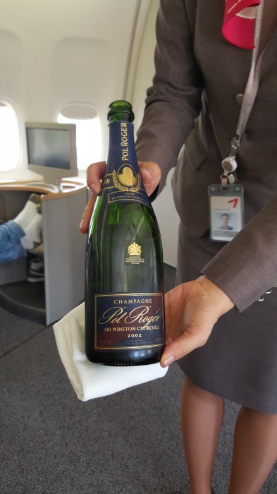 Strax därefter kommer en värdinna och frågar vad jag vill ha att dricka och jag väljer att börja med ett glas 2002 Pol Roger Sir Winston Churchill. Frugan tar samma. Första gången jag dricker den här champagnen och den är riktigt, riktigt bra!