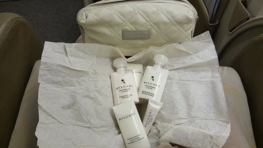 Vi börjar taxa och jag får tid att undersöka necessär och pyjamas. Necessären känns lite tantig till utseendet men innehåller en massa olika Bulgari-grejer.. säkert jättebra om man använder sånt.