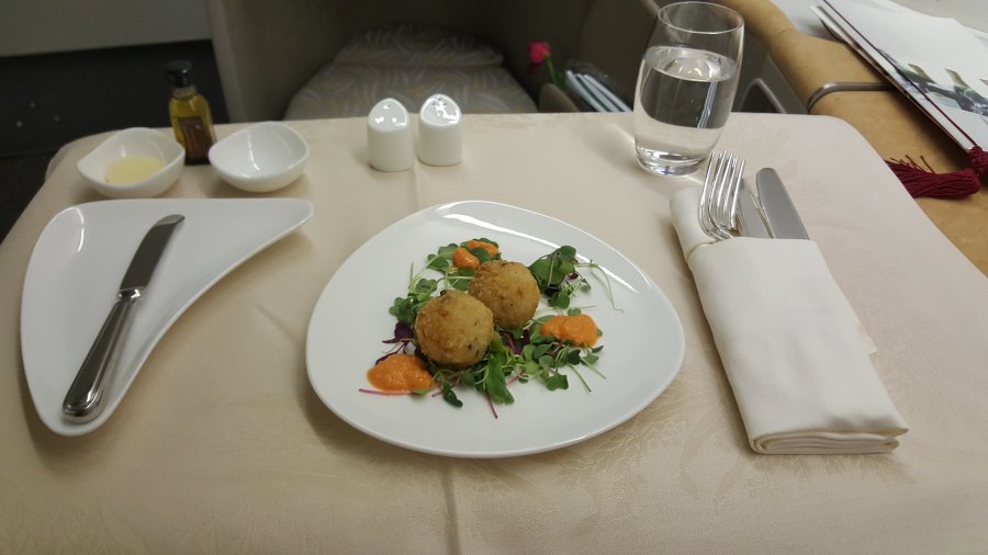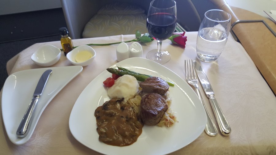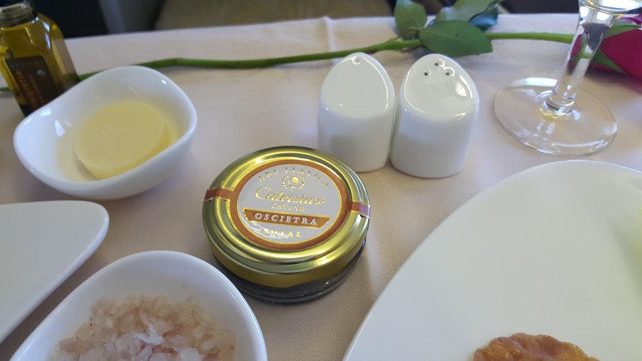 Sen är det dags för kaviaren. Blir tillfrågad om jag vill ha kall vodka till (Asiana 1, Lufthansa 0) och jag frågar vilken vodka det är dom har. Tyvärr säger hon Absolut, så jag väljer istället att fortsätta med champagnen.