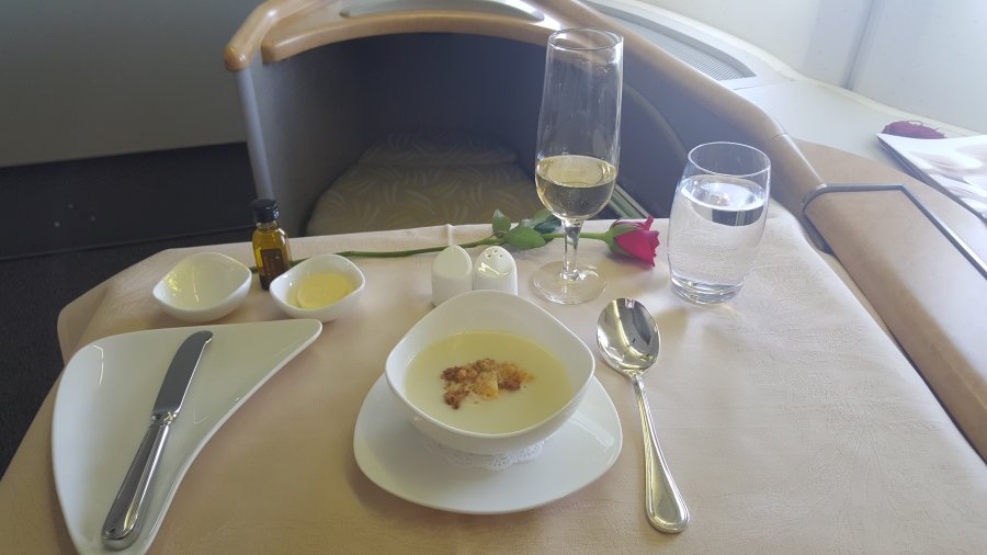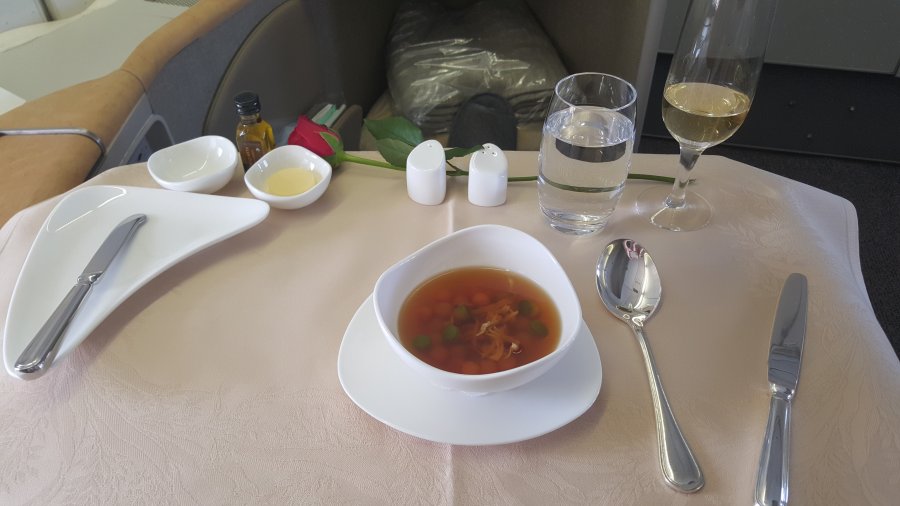 Dags för lite soppa. Inser att det kommer bli fullt i magen om en stund så väljer en kycklingbuljong. Frugan däremot väljer den mastigare blomkålssoppan. Fortsatt champagne i glasen.