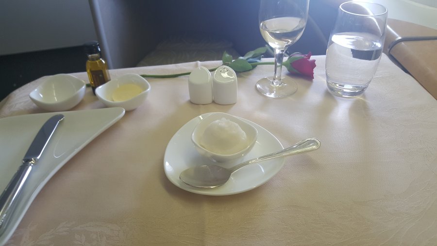 Tillbehören är bättre än på Lufthansa, förutom gräddfilen som smakar filmjölk och citronbiten som är i minsta laget.