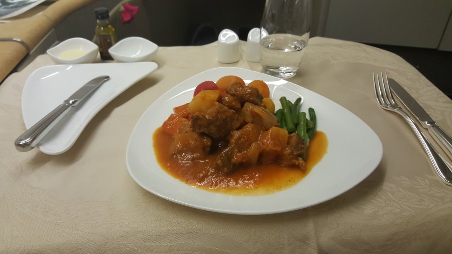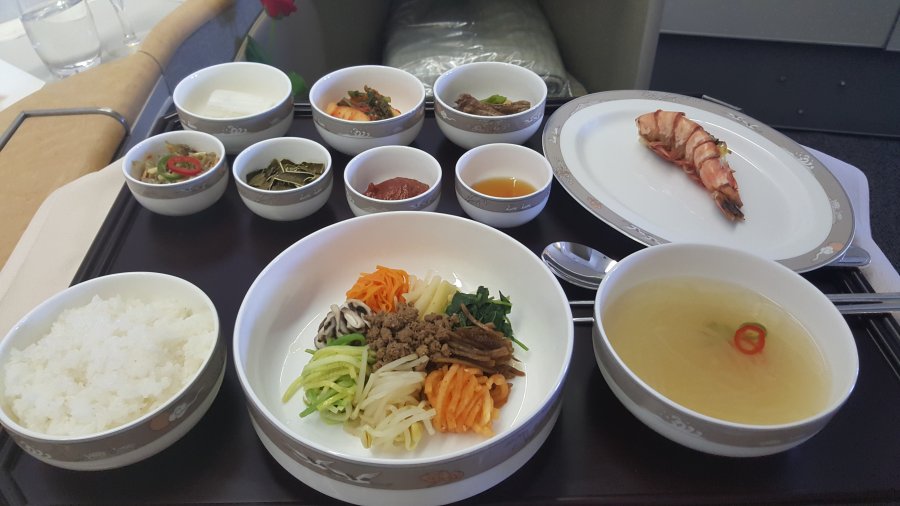 Tittar igenom menyn som både har en västerländsk och koreansk del. Eftersom jag tänkt pröva bibimbapen på nästkommande flygning väljer jag det västerländska alternativet och där den wokade biffen.
