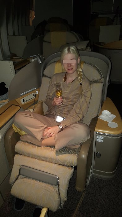 Hon säger att det går bra om nån i crewn följer med, men helst efter maten då dom har lite fullt upp just nu. Hade från början hoppats på att kunna boka ett F-säte med business-service, men det verkade som hela avdelningen var avstängd på den här flighten.
