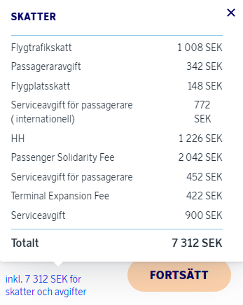 Vi är säkert många som har startar eller har transit i CDG och har märkt att skatterna är väldigt höga. Det finns en ”Solidarity tax” som verkar ligga på ca 1k/pers dock ska detta inte gälla vid transit.