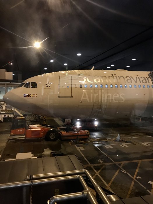 Sitter nu i alla fall på OY-KBI, snabbaste boardingen med SAS någonsin. Men då är vi uppskattningsvis bara ett 30-tal ombord också. Kapten säger dock att det är mycket cargo. Känns nästan lite kusligt att va så få, kan räkna till enbart 4personer i hela pluskabinen. Konstigt nog har bara en del av besättningen masker, men inte alla. Undrar om det är frivilligt för personalen att använda det?