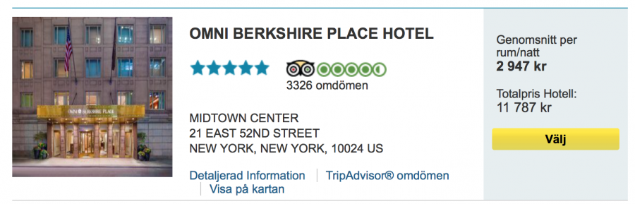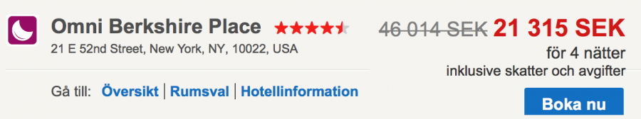 Jag ska besöka New York nu i vår mellan den 8:e och 12:e mars och bokade i helgen upp mig på Grand Hyatt. Av en slump så kikade jag idag in American Express hotellbokning och hittade en hel del intressanta alternativ, bland annat Omni Berkshire Place.