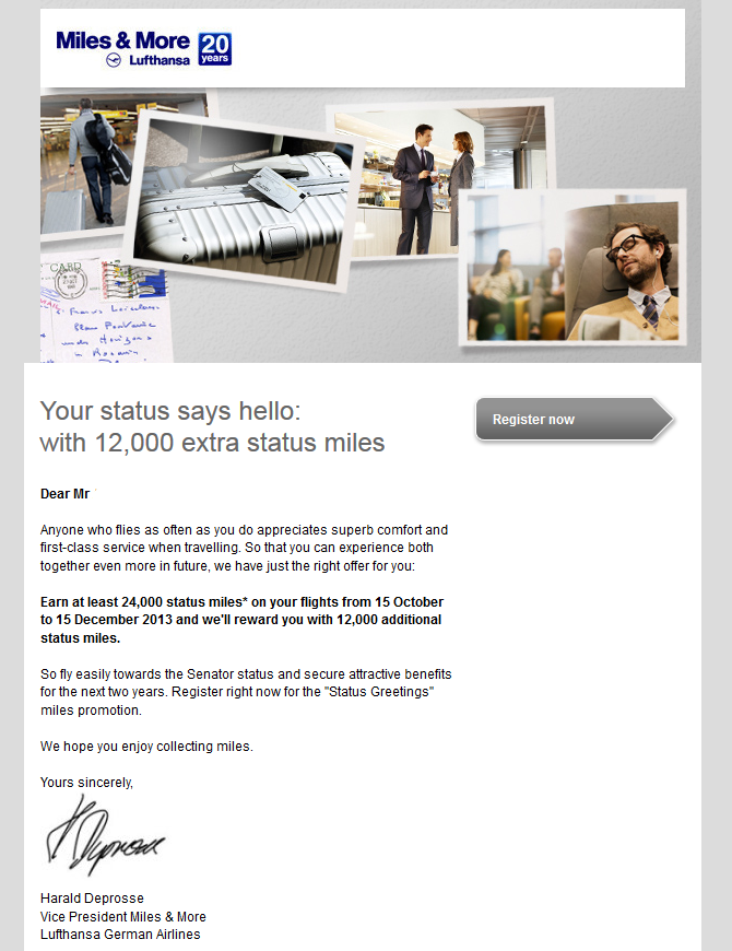 Blev därför ganska förvånad när mailet nedan dök upp i dag. Riktad kampanj med möjlighet till 12k extra status miles om jag flyger in 24k vanligt plus att dom explicit pushar för att jag är nära att nå Senator. Har läst en del andra skräckhistorier och haft en del egna konstigheter på vägen så hade nästan inte blivit förvånad om det istället börjat "strula" med poängregistreringen nu när jag närmar mig.