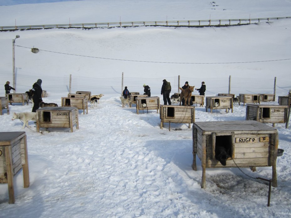 Första dagen blev det en lång promenad runt byn, besök på museet, samt stopp på diverse lekplatser. Andra dagen promenad i byn och på eftermiddagen var det dags för en tur med hundsläde. Totalt var aktiviteten beräknad till fyra timmar, men effektiv tid med körning var ca 1,5 h. Övrig tid gick åt till transport, visning av hundgården och påselning av hundar. Detta var något som uppskattades av barnen som tyckte det var spännande att sela på och släpa 6 stycken Alaskan huskies till släden. Fråga mig inte hur man lyckas skilja på 60-70-talet hundar som fanns i hundgården.