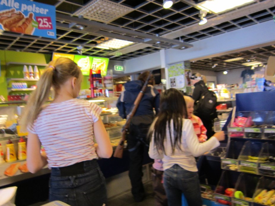 Tredje dagen ägnades också till en början åt promenad i byn med besök på några lekplatser samt glassätning. Skatebordrampen utanför cafét var roande. Dessutom har man relativ liberala vapenlagar här. Du får inte ta med dig bössan på banken,men det är ok i snabbköpet.