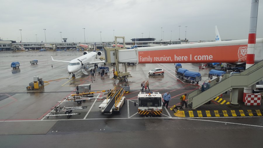 Väl på Schiphol landar vi någonstans ute på vichan, och får så spendera 15min på taxningsbanor innan vi till slut når fram till terminalen. Väl av flyget är det ytterliggare 10min gångväg tills jag äntligen kommer ut ur själva terminalen och kan ta riktning mot hotellet.