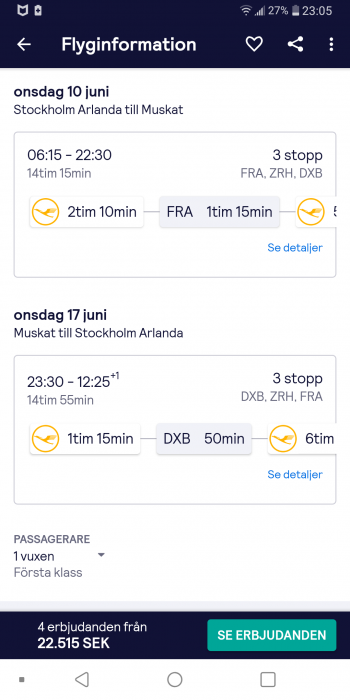 Första klass med Swiss med besök i både FCT i Frankfurt och FCL i Zürich. En timmes stopp i Dubai, tror inte att du kan lämna planet.
