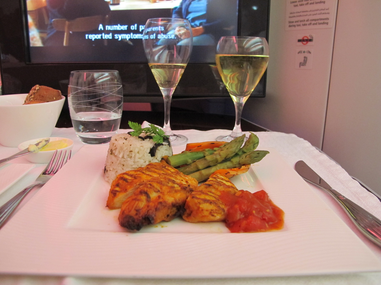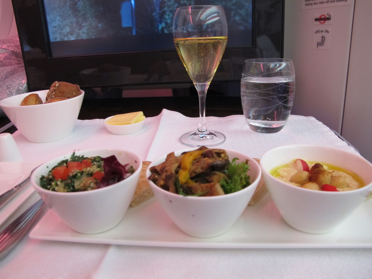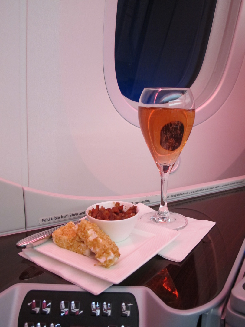 Jag var snabb med att gå ombord, inte en sekund fick förfaras och tja, vad kan jag säga? Dreamlinern var helt fantastisk faktiskt! Superb service, artig, uppmärksam, lite rolig och snabb. Det enda jag kan anmärka på är att de kanske var väl snabba med att vilja plocka av saker från bordet, men det är ju en småsak egentligen. Det gällde att hålla i glasen (hälla bort champagne är enligt mig första klassens alkoholmissbruk).