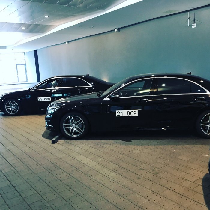 Väl när planet parkerat syntes ingen bil till. Men när vi tog vårt bagage hälsade flygvärdinnorna att det stod en bil och väntade på oss. Där nedanför trappan stod en finklädd herre redo att se våra boardingkort och att eskortera oss i Mercedesen till huvudterminalen.