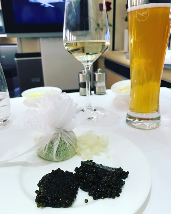 Den obligatoriska kaviaren, en veteöl samt en glas vin från Marlborough Nya Zeeland.