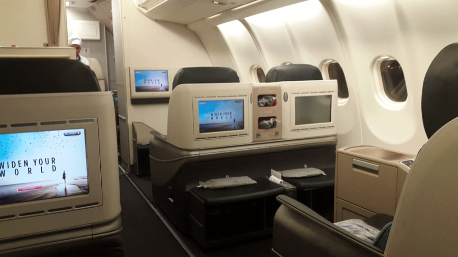 Det skulle dröja ca 30 (!) minuter innan de fick fram en buss, under tiden flöt blippade och ej blippade pax ihop till en stor svettig massa. Gatepersonalen passade för övrigt på att lämna platsen under detta kaos. När sen en buss dök upp så behövde man gå igenom allas boarding pass en andra gång. Väl på planet visade det sig vara gammalt och slitet, betydligt sämre än TK1796 nio dagar tidigare. Business visade sig i princip vara Eco med seatblock, i trång 3+3 config. I väntan på att lyfta tilläts passagerare att springa fram och tillbaka på toaletterna, vilket gjorde att personalen hade stora problem med att räkna in alla. Ytterligare 30 minuters väntan på marken vidtog innan vi äntligen var i luften.