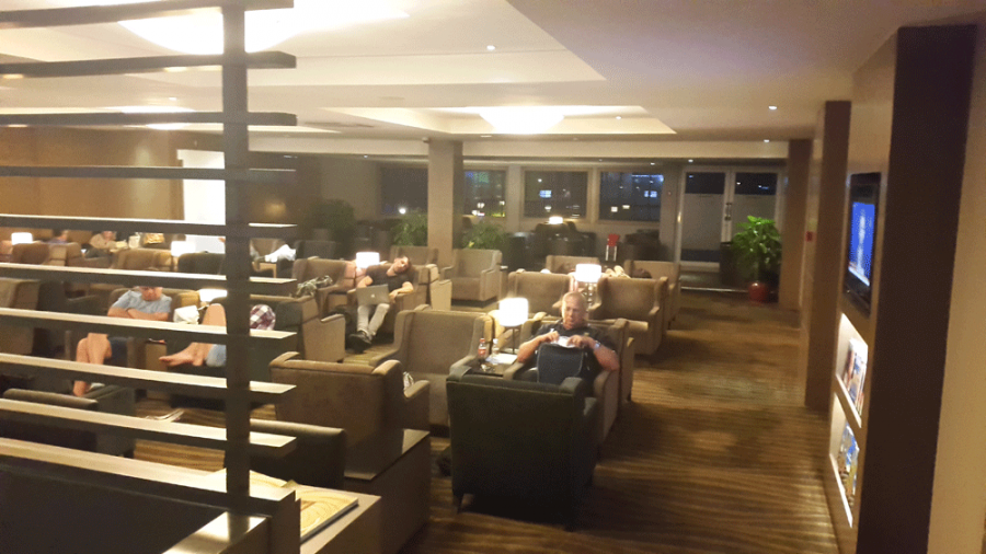 Denna desk visade sig ligga aningen avlägset ute i själva ankomsthallen, vilket inte alls framgick från början. Väl där förklarade vi ärendet, fick lämna ifrån oss biljetterna och ombads att vänta ”a short while” - inne på det intilliggande Starbucks (!). Efter tio minuters väntan kom en kille ut och ropade att han hade några hotellrum klara - varpå halva caféet ställer sig upp och stormar dit! Det visar sig att han har fyra (4) rum klara. Klart nedstämda går vi tillbaka till kassan och får då veta att det kan ta tid det där, sen måste man invänta en shuttle bus och sen var det tydligen en bit att åka också. Den utlovade sömnen var bara att glömma insåg vi, och hämtade tillbaka våra biljetter för att ta oss till CIP-loungen istället.