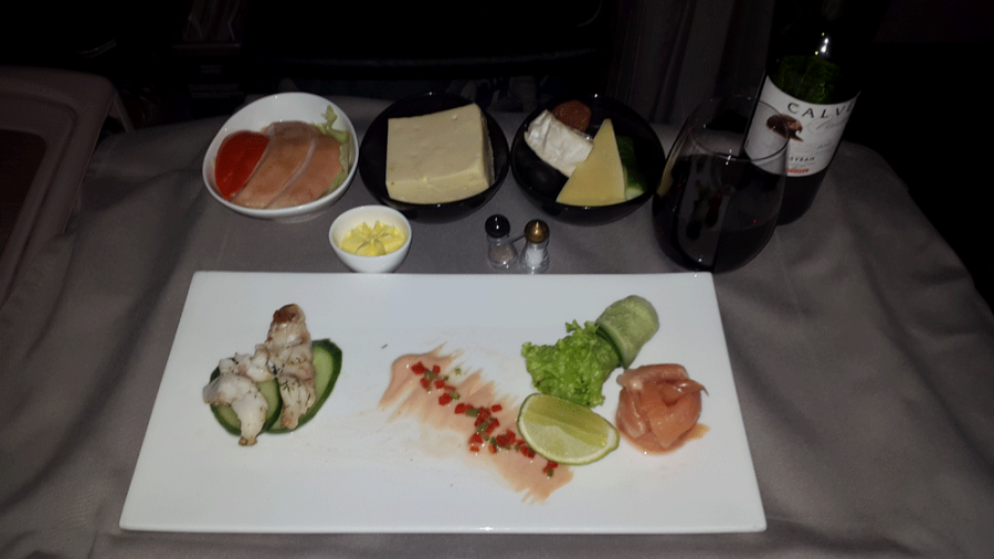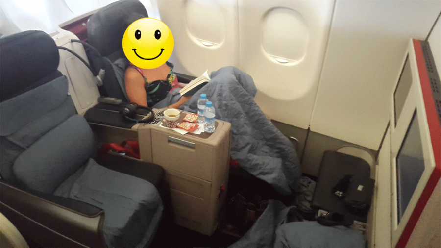 Planerad 0055, avgick 0121. Fina flat bed-säten i 2+2+2 config, riktigt bra mat. Flickvännen låg raklång, jag fick kura ihop mig lite när det var dags för sömn.