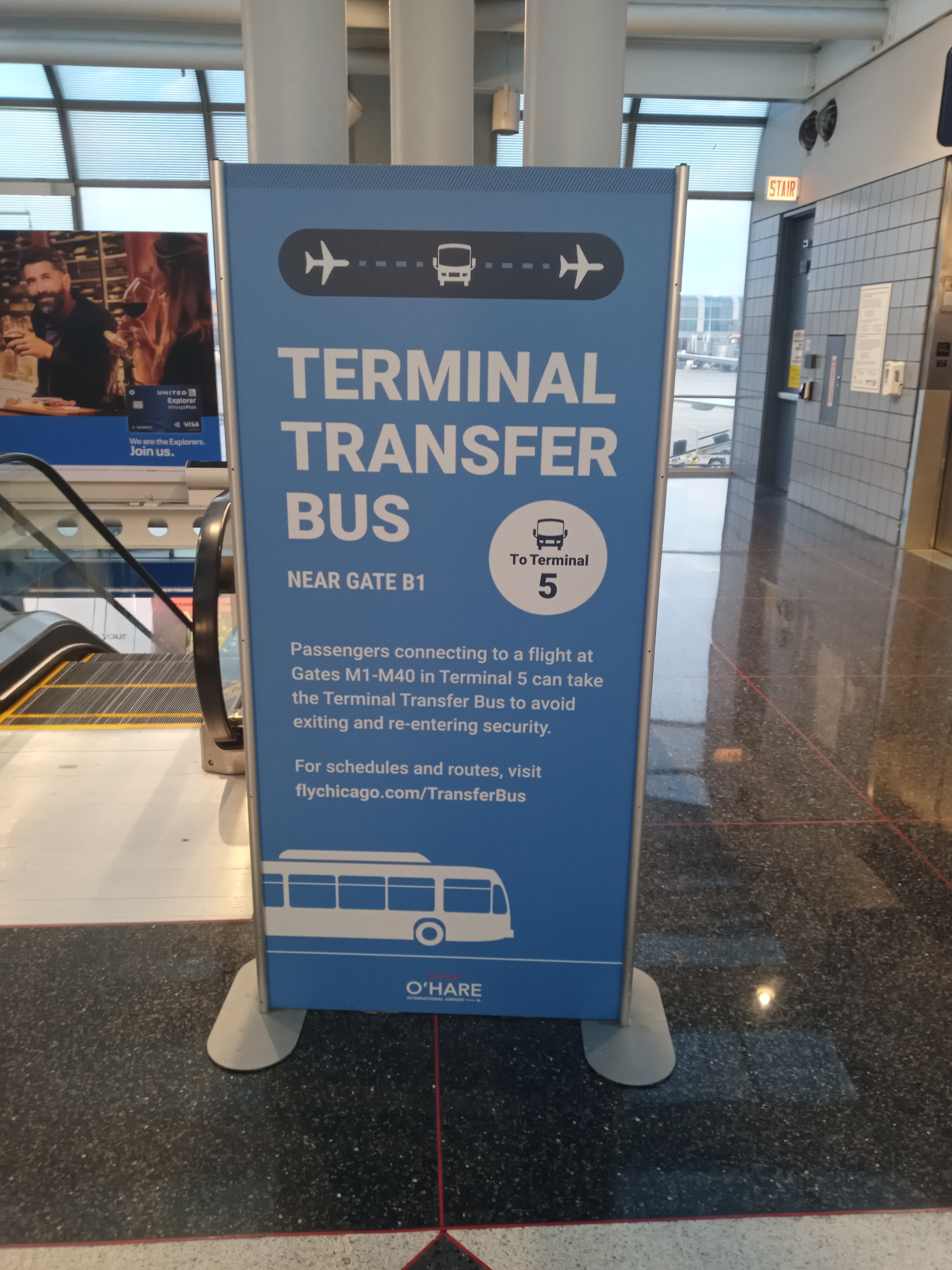 Checkade in 17:30 för LO4 21:45, tog tåget till T1 och genom fast track till vänster. TSA påpekade att jag var i fel terminal, men släppte igenom med loungebesök som förklaring. Höger, vänster genom gången T1 B<->C och in vid 17:50 till Polaris för drink, burgare, öl och efterrätt. Åter cirka 19:45 T1 B<->C till B1 (stod en roll-up om bussen vid underjordiska gången, samt en del takskyltning mot T5) till fålla vid gate B1. Koll av pass och boardingkort vid fållan och bussen, och vi fick varsin grön lapp som lämnades när vi kom till M13 i T5 cirka 20:20. Bussen skall gå var 15:e minut fram till 21:30.