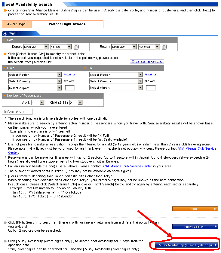 1, När man har kommit till Partner Flight Awards, klicka på "7-Day Availability (direct flights only)"