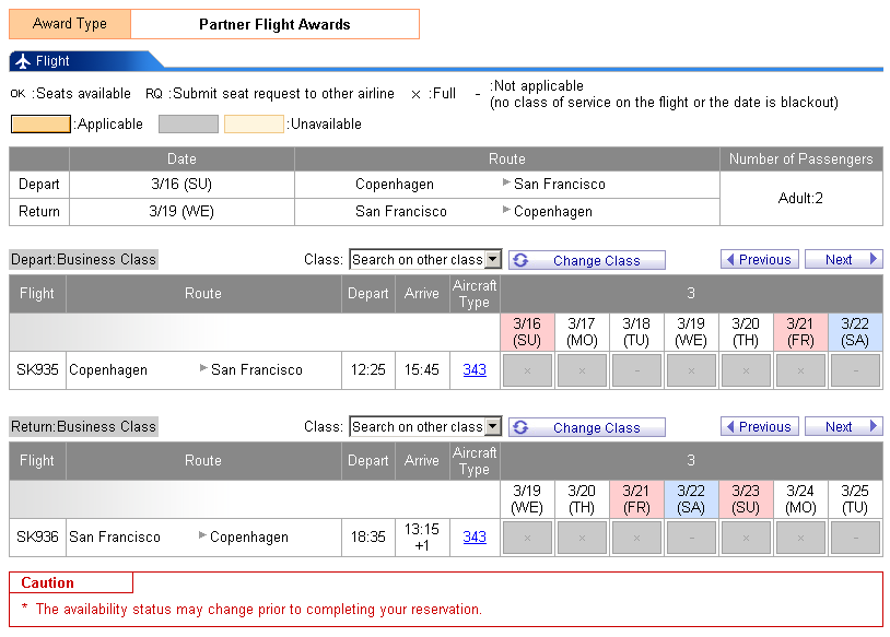 Om du ser gul/orange färg på något av datumet då finns det 2 lediga platser i Business class.
