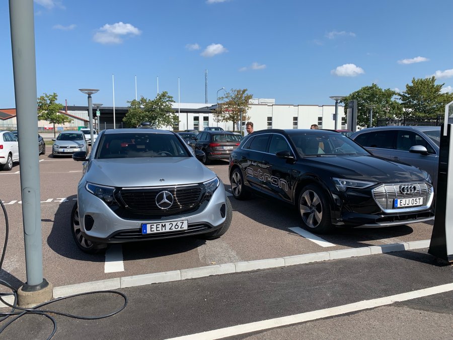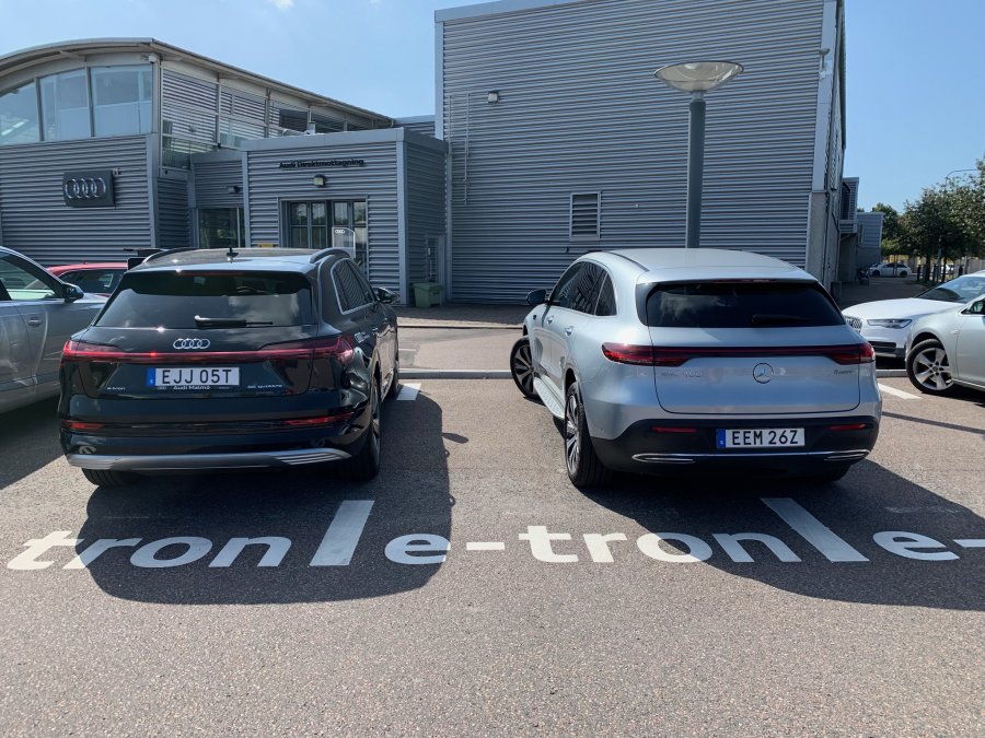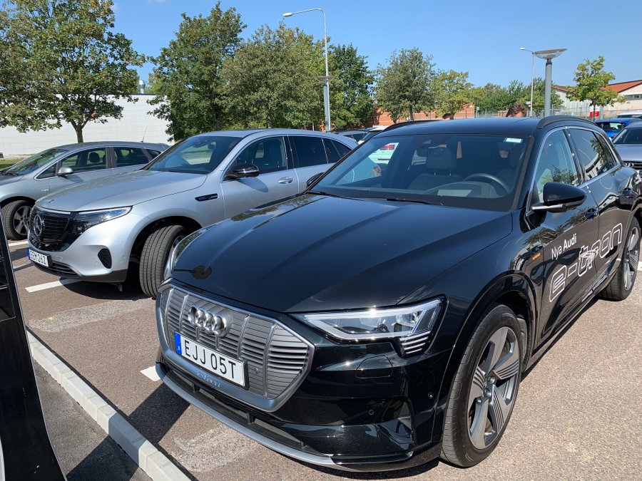 Audi E-tron Proline 835.000:- utseende lika EQC och inredningen påminner en Q5. Klart tystaste och skönaste bilen att köra både i stadstrafik och motorvägsfart. Lite bredare än EQC men ändå lätt manövrerad. Leveranstid 2020 mars