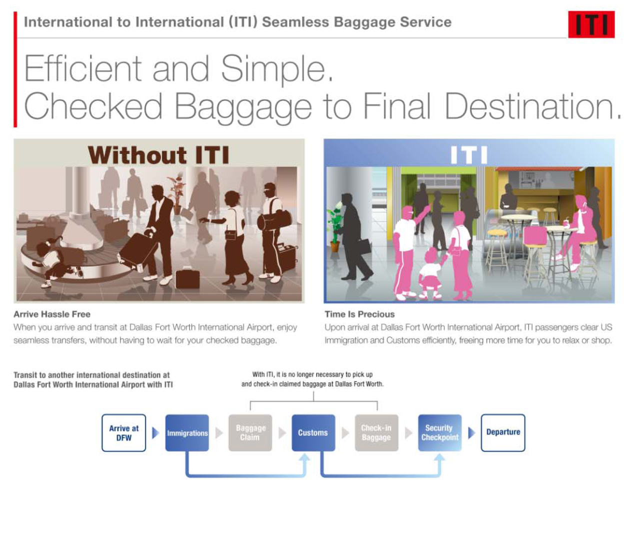 "International arriving passengers must claim their luggage before clearing U.S. Customs. Some airlines check bags directly from international city of origin to international final destinations (ITI). Please contact your airline for more information about ITI bags."