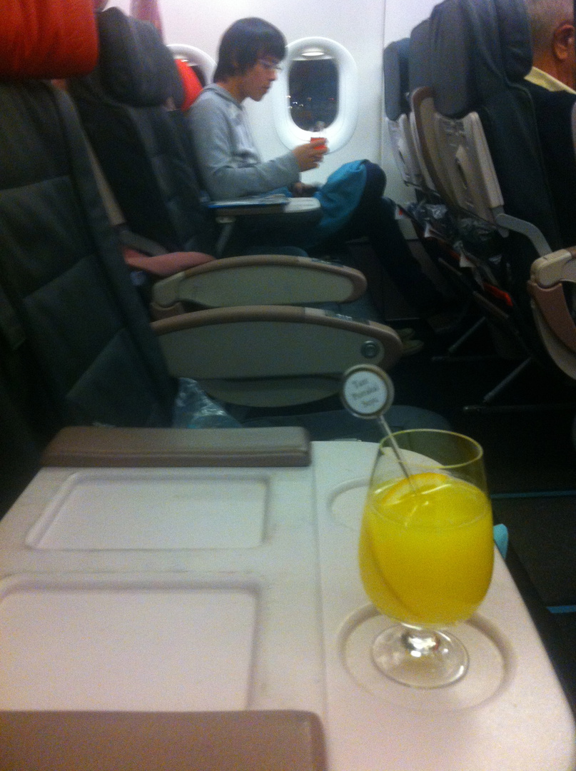 Löftet om att alla plan mellan Stockholm och Istanbul skulle ha de speciella business-säten uppfylldes i alla fall inte denna resa utan jag fick hålla tillgodo med blockerat mittensäte. Således heller ingen IFE ombord förutom skärmarna i taket. Efter att jag satt mig ner kom en flygvärdinna ganska snart fram och erbjöd välkomstdryck. Vatten, apelsinjuice och någon lemonad fanns det att välja på. Jag valde apelsinjuicen som visade sig vara oerhört sur.