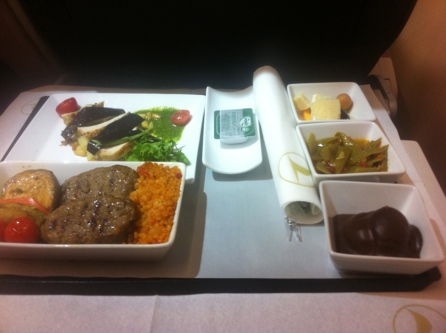 Eftersom planet avgick 00:55 hade det såhär med facit i hand varit bättre att försöka få något att äta i loungen i Istanbul. Men jag ville ju prova den omtalade turkiska ombord-maten. Eftersom flyget avgick så sent hade jag hoppats på en ganska snabb och smidig matservering. Men inte då. Först omkring 2 timmar och 30 minuter efter avgång var vi någorlunda klara med matserveringen. Jag hade då ungefär 5 timmar kvar av resan. Nästa gång väljer jag att äta i loungen.