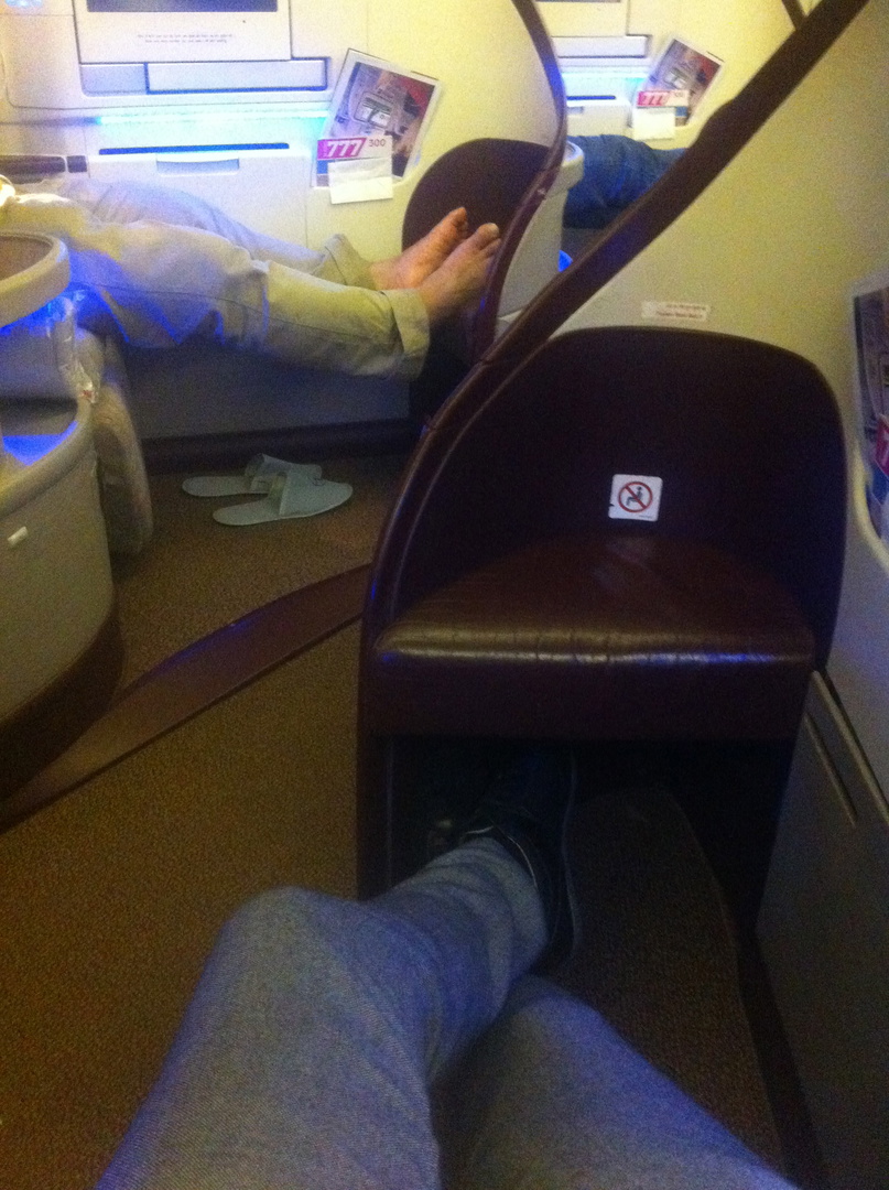 På planet mellan Istanbul och Bangkok används en Boeing 777 från Jet Airways med en liten förstaklasskabin med 8 säten som används som business class-säten. Försökte boka in mig på dessa men de var så klart upptagna eller blockerade. Fick nöja mig med en av de vanliga business class-säten i fiskbenskonfiguration. Fick utsikt över herren snett mitt emot som givetvis tagit av sig strumporna och satt med bara fötter framför näsan på mig. Inget fan av fiskbenskonfiguration kan jag säga nu. Svårt att titta ut också!