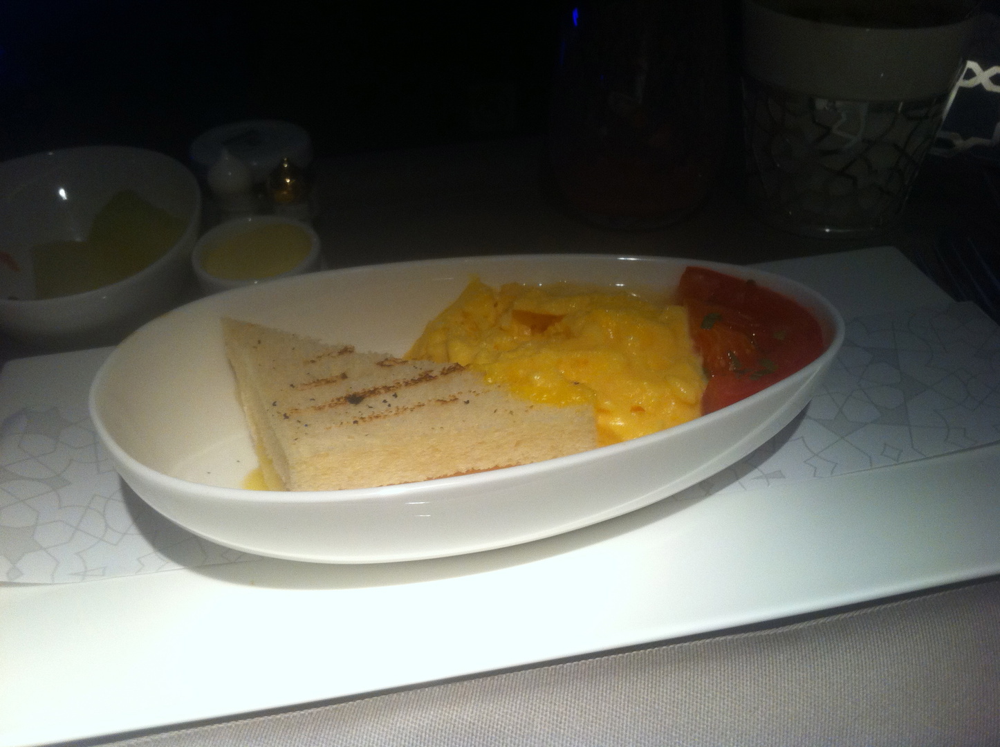 Jag tycker själv att det är bra att de serverar en full måltid trots att flyget går kl 3 på natten, men de borde dock erbjuda ett expressalternativ för de som hellre vill maximera sömnen. Frukosten är dock ganska dåligt varierad, och hade hellre sett att de erbjöd pannkakor eller french toast som ett alternativ till äggröran.