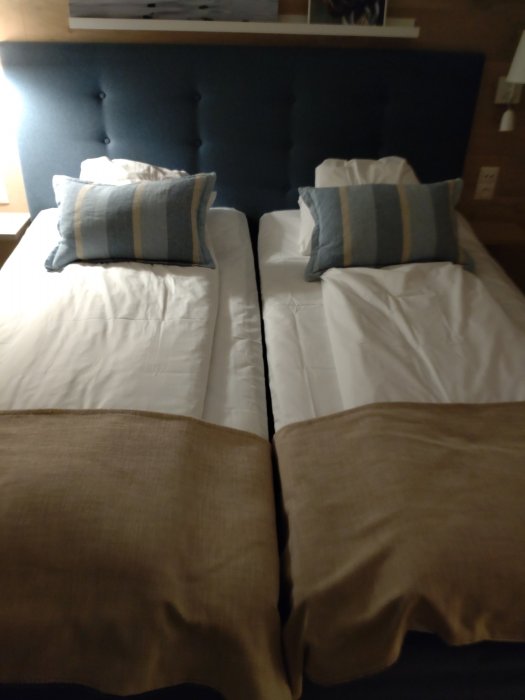 Motsvarande gäller när man med kollega/polare bokar twin beds/två sängar, och får två sängar ihopstyrda till en ”dubbelsäng”. Vill ju inte direkt ligga och skeda med kollegan. Speciellt irriterande när sängarna inte går att separera pga sängbord eller annat som blockerar.Viktigt meddelande till alla nordiska hotell: