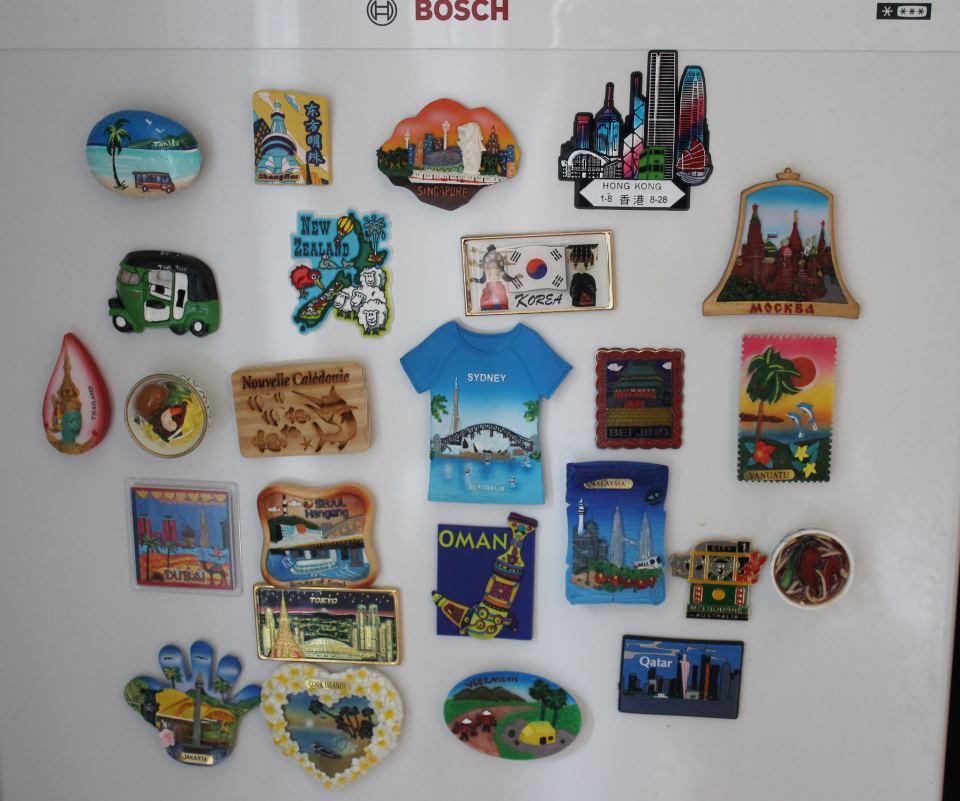 Däremot har jag faktiskt en liten samlarhobby och det är att köpa en kylskåpsmagnet från varje större stad jag besökt, i alla fall städer utanför Europa. Har hållit på med detta i tre år nu och har kommit upp i 25 st så här långt. Som ytterst morgontrött person blir man på ganska gott humör när man får börja dagen med att titta på magneter från exotiska länder.
