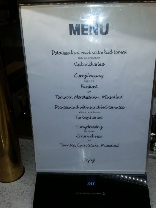 På T4 vid samma tid fick vi hålla tillgodo med morots- och gurkstavar med guacamole och humus. Åtm något bättre än bara potatischips...Idag serveras lax och pastasnäckor i SAS Gold Arlanda T5. Skönt med variation.