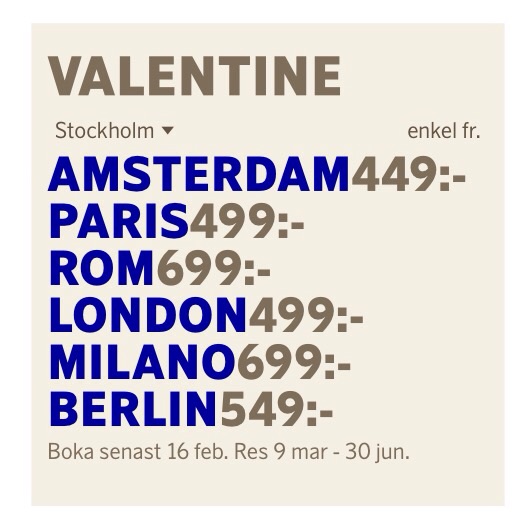 Tänkte höra om ni känner till några flygbolag som brukar sälja ut billiga platser framöver i samband med valentine's day?